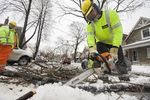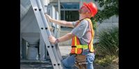 an electrician on the job with personal protective fall arrest equipment on a highrise with high viz
